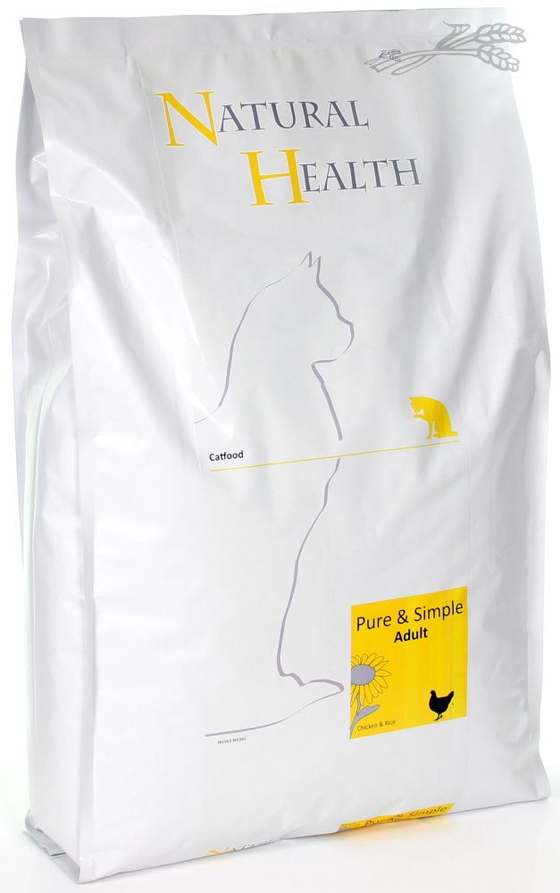 Natural Health Pure & Simple Adult is een smakelijke brok op basis van 1 eiwitbron, kip. De brokken bestaan uit natuurlijke ingrediënten die zeer smakelijk zijn en bieden alle voedingsstoffen die nodig zijn voor de gezondheid en welzijn van uw kat.