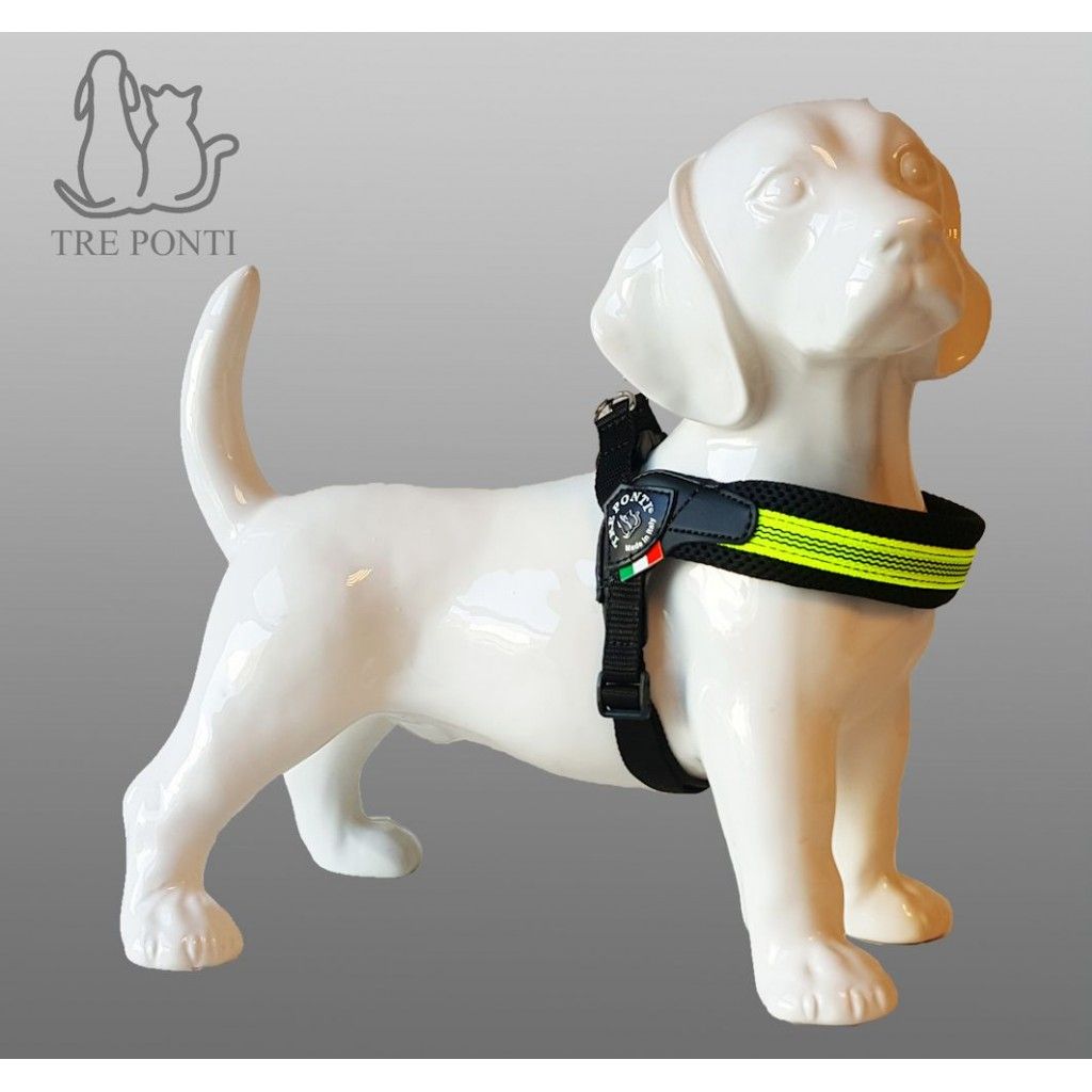 De handgemaakte, Italiaanse Fibbia Basic verstelbare tuigjes van Tre Ponti zijn ontwikkeld als wandel tuigje en geschikt voor kleinere honden van 1 tot maximaal 14 kilo. De bovenzijde van dit instaptuig is voorzien van een gesp en 2 ringen om de lijn aan te bevestigen (altijd beide ringen gebruiken). Het kunststof basismateriaal is sterk, neemt geen water op en houdt geen haren vast. De verstelbare Fibbia tuigjes zijn optimaal als de hond nog in de groei is of regelmatig getrimd wordt.
